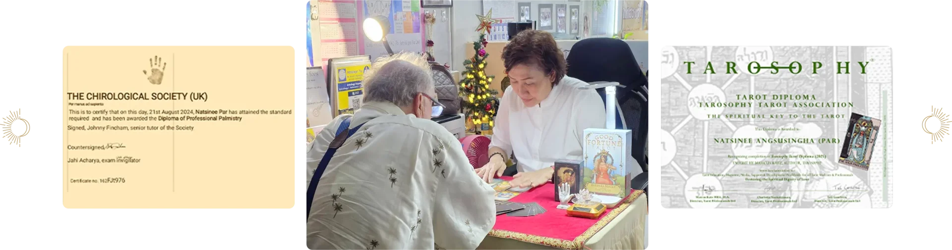 With an accredited UK Diploma in Tarot and Palmistry, I provide insightful readings in both English and Thai, helping clients from around the world gain clarity, confidence, and peace of mind.
